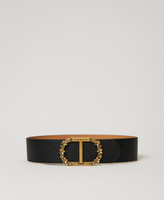 Cintura effetto pelle a vita alta con Oval T a motivo floreale, galvanica in ottone anticato, chiusura con nottolino.
