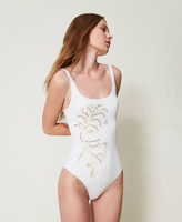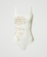 Costume intero con ricamo piazzato Cornely in filo e strass termoadesivi. Senza imbottitura, ha ferretto, spalline ampie regolabili, chiusura con gancio dietro, logo a cuore in metallo sul retro.