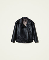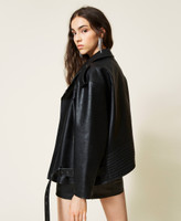 Giacca chiodo ampia collezione Actitude in tessuto spalmato con zip in metallo, alamari sulle spalle, passanti e cintura al fondo.