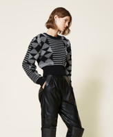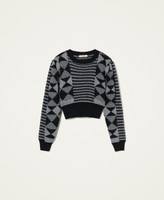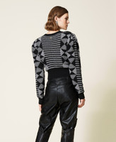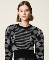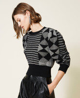 Maglia jacquard lurex con disegni geometrici, collo tondo, spalle scese con arricciatura, fondo alto a coste.