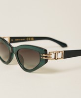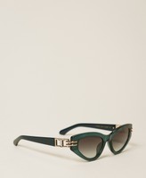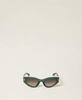 Occhiali da sole a farfalla in acetato con logo in metallo inserito nelle stanghette. Il modello è abbinato a una custodia con logo.