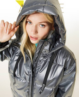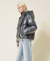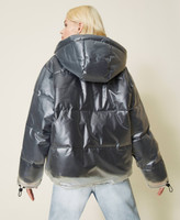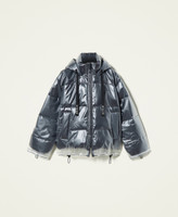 Piumino boxy collezione Actitude in nylon e PVC, con cappuccio e coulisse logata, zip pressofusa, tasche con maxi filetti.