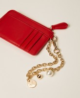 Portacarte effetto nappa di vitello liscio con logo lettering in metallo. Chiusura a L con zip, tasca portamonete, catena con charms applicati da aprire tramite moschettone per agganciare l'accessorio alle borse.