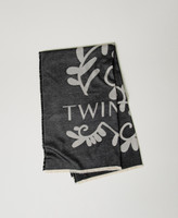 Sciarpa in misto viscosa jacquard bicolore a fantasia floreale con logo lettering e micro frange al fondo.
