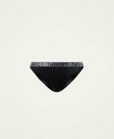 Slip brasiliana con inserto di strass e logo in vita, tessuto doppiato sul retro che rimane invisibile sotto gli abiti.