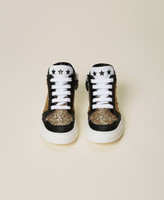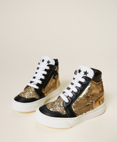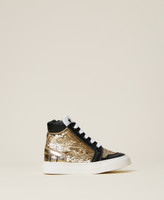Sneakers alta in pelle laminata e paillettes, logo sul retro, zip laterale interna, fondo in gomma.