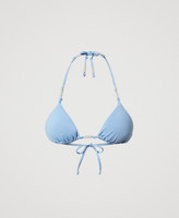 Triangolo da bagno con laccetti rifiniti da perle e nodi. Imbottito con coppe estraibili, ha laccetti da annodare dietro al collo o da indossare come spalline grazie alle asole presenti alle estremità, stecche laterali e chiusura a fiocco sul retro.