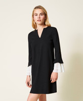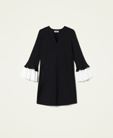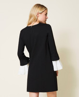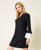Abito corto in punto Milano stretch con polsi a volant e inserto in crêpe de Chine plissé, zip sul retro.