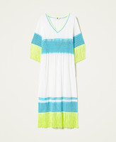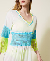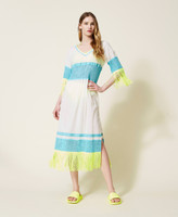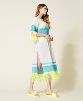 Abito caftano longuette in mussola di cotone con ricamo, scollatura a V, maniche a tre quarti, frange e inserto traforato.