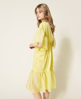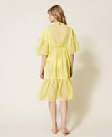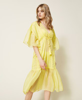 Abito caftano longuette in creponne con inserti jacquard, maniche ampie, coulisse e cintura.