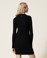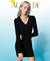 Key-item trasversale. Abito corto fitted in misto viscosa a costine con scollatura a V e colletto a camicia, bottoni a pressione, maniche lunghe. Da indossare anche come cardigan, secondo i gusti.