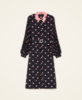 Chemisier dress di carattere. È in crêpe de Chine stampato a pois con colletto in colore a contrasto, maniche lunghe plissé con ricamo elastico ai fondi, chiusura con bottoni ricoperti, foderato. Da indossare con o senza la cintura con fibbia gioiello.