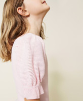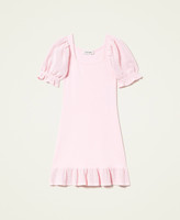 Grazioso e di tendenza, l'abito corto da bambina in costina misto viscosa ha lunghezza sopra al ginocchio, scollo squadrato, maniche corte a sbuffo e balza al fondo arricciate in punto punzonato, fondo manica con elastico inserito e balza. Perfetto in vacanza e in città, completato da ballerine o sneakers.