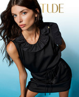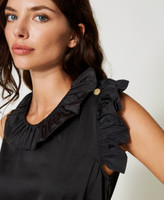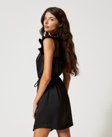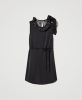 Abito corto collezione Actitude in envers satin con balze in taffetà, spalla con bottoni a pressione e inserto in pizzo, cintura abbinata.