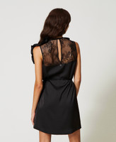 Bon ton inedito. Abito elegante corto in envers satin con balze in taffetà, spalla con bottoni a pressione e inserto in pizzo in trasparenza all'interno, apertura a goccia con bottone sul retro. Fit straight da regolare in vita con la cintura in coordinato.