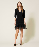 Abito corto in viscosa stretch con fondo a doppia balza arricciata in tulle plumetis foderata, linea svasata.