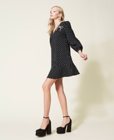 Timeless e versatile. Abito corto A-line in punto Milano stampato a pois con scollatura a V profonda, maniche a tre quarti e balza leggermente arricciata al fondo. È impreziosito dalla spilla a fiocco con strass rimovibile. Con tacchi alti o flat shoes a seconda dei gusti.