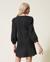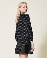 Abito corto collezione Actitude in punto Milano stampato a pois, con spilla a fiocco rimovibile, linea svasata.