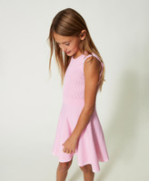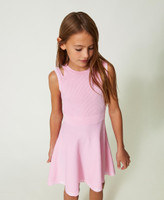Design ricercato per l'abito corto da bambina in viscosa stretch con gonna svasata in flexage, dettagli di logo jacquard in colore a contrasto, cut-out sulle spalle e corpino a costine. Con sneakers e ballerine a seconda dell'occasione.