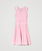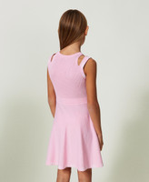 Abito corto in viscosa stretch con gonna svasata in flexage, dettagli di logo jacquard in colore a contrasto, cut-out sulle spalle.