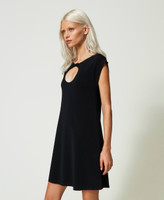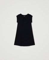 Abito corto collezione Actitude maglia stretch con oblò davanti e fiocco applicato, linea svasata al fondo.