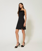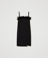Abito corto in jersey punto Milano di misto viscosa stretch, dalla linea fitted, con profilo di piume in tinta, spalline sottili.