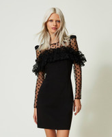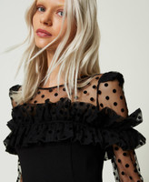 Abito corto in punto Milano, dalla linea fitted con carré e maniche lunghe in tulle floccato, volant arricciato con impuntura centrale sul davanti che crea alette sulle maniche, spalline rinforzate con dettaglio di volant, chiusura a goccia sul retro con bottone. Eleganza impalpabile e raffinata per le occasioni speciali.