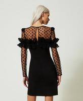 Abito corto fitted collezione Actitude in punto Milano con spalline, carré e maniche in tulle flock con volant.