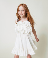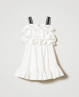 Abito corto in popeline di cotone stretch con volant arricciati sul corpetto, balza al fondo, spalline con stampa logo.