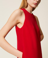 Abito corto in cady crêpe con dettaglio di catena Oval T rimovibile, da indossare come collana. È smanicato e ha tasche inserite nei fianchi, chiusura con zip invisibile sul retro, linea svasata.