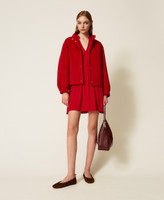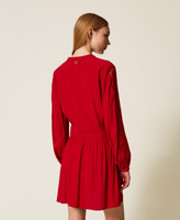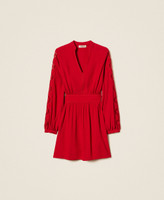 Abito corto in crêpe leggero di viscosa con ricamo geometrico su scollo, baschina e carré. Ha scollatura a V, maniche lunghe con ricamo floreale traforato, taglio baschina in vita sagomata da cui parte un’arricciatura che crea volume, chiusura con zip invisibile al fianco, linea morbida.
