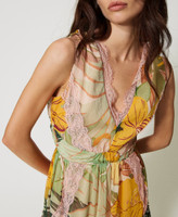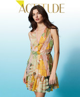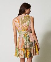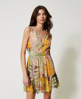 Abito corto collezione Actitude in creponne stampato, con inserti in pizzo a contrasto, scollo profondo a V, vita effetto cintura con nodo.