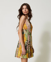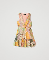 Silhouette flattering per l'abito corto in creponne stampato, con corpetto fitted e gonna svasata con balza arricciata. Scollo profondo a V, senza maniche, con arricciatura sulle spalle, punto vita effetto cintura con nodo, zip al fianco, dettagli rifiniti da pizzo applicato a contrasto.