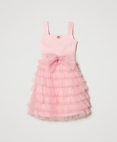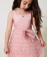 Abito da bambina con top doppiato in duchesse e gonna con costruzione a strati di balze in tulle. Ha lo scollo dritto, spalline larghe, chiusura con zip invisibile laterale, ricamo a punto smock sul retro, fodera in jersey, linea leggermente svasata. In coordinato presenta la cintura rimovibile in duchesse con fiocco in tulle, elastico sul retro e bottoni a pressione. Questo abito è perfetto per una cerimonia.