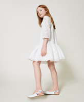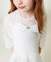 Fascino iconico per l'abito corto da bambina in pizzo floreale decorato da fiocco in raso applicato al centro. Ha il collo tondo, il carré e le maniche a tre quarti in trasparenza, la balza arricciata al fondo, la chiusura con zip sul retro, la fodera in duchesse. Per una festa o una cerimonia completato da ballerine o sandali eleganti.