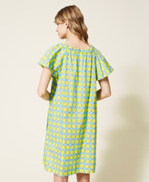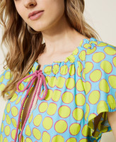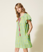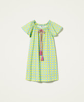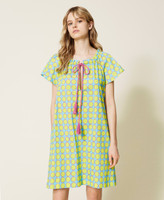 Una coloratissima stampa a pois disegnata in esclusiva per Twinset caratterizza l'abito corto in popeline stretch con scollatura a barchetta regolabile tramite coulisse e cordoncino in cotone intrecciato con nappe al fondo, apertura davanti a goccia, maniche ampie ad aletta, tasche ai fianchi, sfoderato. Al mare ma non solo, con accessori in tinta.
