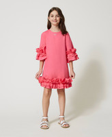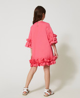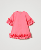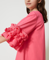 Abito corto svasato in popeline di cotone stretch con balze arricciate ai fondi, apertura a goccia con bottone, maniche a tre quarti.