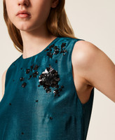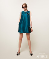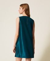Abito corto collezione Actitude in raso shantung con ricamo fatto a mano di perline e paillettes in contrasto colore. Ha scollo tondo, spalline larghe senza maniche, apertura a goccia sul retro, fodera interna e linea svasata.