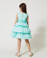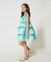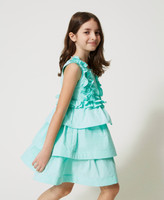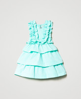 Abito corto svasato in taffetà, senza maniche, con volant verticali applicati sul corpetto davanti e dietro, fodera in mussola.