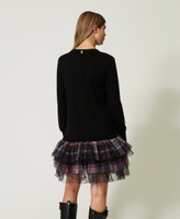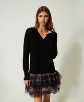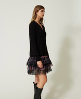 Abito corto Limited Edition collezione Actitude in misto viscosa con applicazione di tulle con stampa Principe di Galles multicolor.