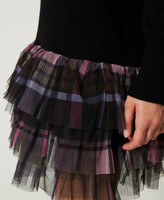 L'artista MYFO firma l'abito corto in maglia rasata di misto viscosa con applicazione di tulle a strati con stampa Principe di Galles multicolor. Scollo a V, maniche lunghe sostenute da spalline imbottite. Sorprendente e girly, per aggiornare la selezione urbanwear.