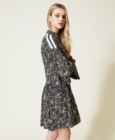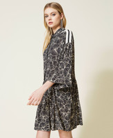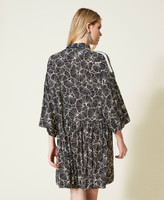 Abito corto chemisier in crêpe di viscosa con stampa foglia ginkgo, righe intarsiate sulle spalle, balza arricciata.