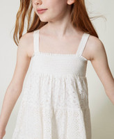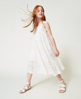 Un modello, due possibilità di stile. Questo abito da bambina si può indossare anche come gonna grazie alle spalline rimovibili e alle impunture elastiche del corpetto. È realizzato con bande in pizzo floreale alternato a sangallo e ha una linea svasata. Con sandali logati per un tocco personalizzato.