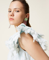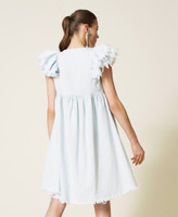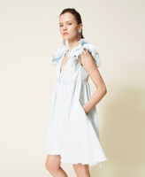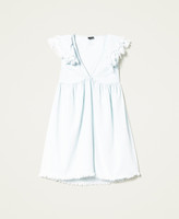 Love forever. Abito corto in denim leggero e fluido, con scolatura a V, taglio a impero, gonna arricciata, fondo sfrangiato. Maniche costruite a doppia balza sfrangiata.