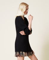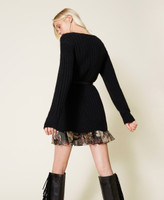 Abito corto in misto lana a coste, abbinato a sottoveste in crêpe de Chine con balza in creponne stampato.