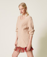 Abito corto in misto lana a coste, abbinato a sottoveste in crêpe de Chine con balza in creponne stampato.