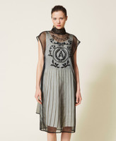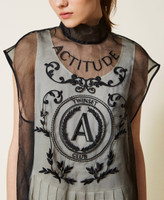 Abito corto collezione Actitude in organza con ricamo logo, abbinato a sottoveste in twill con gonna plissé.