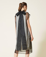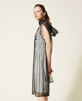 Versatile ad effetto see-through. Abito corto in organza a contrasto con logo in filo ricamato davanti, collo alto e nastri sul retro da annodare a fiocco, abbinato a sottoveste in twill, con taglio in vita, zip al fianco e gonna plissé. I due capi sono tenuti insieme da piccoli bottoni cuciti sulla spalla.