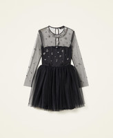 Party dress con corpetto sagomato in raso, maniche e carré in tulle see-through con ricamo fatto a mano di castoni. La gonna è costruita a strati con tulle rigido che dona struttura e volume. Zip a fianco e apertura a goccia con bottone sul retro. Da indossare con o senza il nastro di gros-grain in vita.