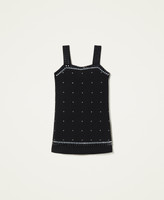 Abito corto in tessuto scuba con spalline ampie, applicazione di borchie, zip al fianco, sfoderato.